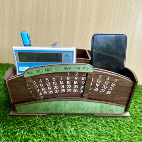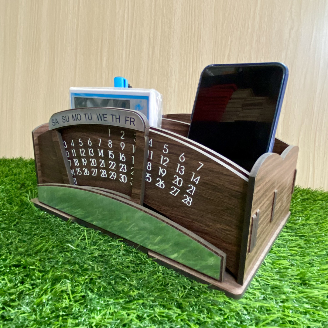 Desk Organizer with Lifetime Calendar, and 4 Compartments – Elegant Wooden Table Organizer for Office and Home Use