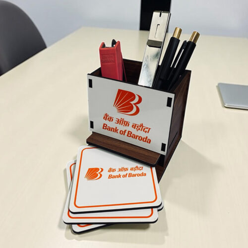 Wooden Pen Stand with Tea Coaster and Mobile Stand